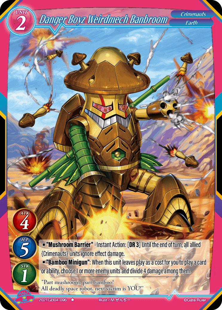 ■"Bamboo Minigun": When this unit leaves play as a cost for you to play a card or ability, choose 1 or more enemy units and divide 4 damage among them.