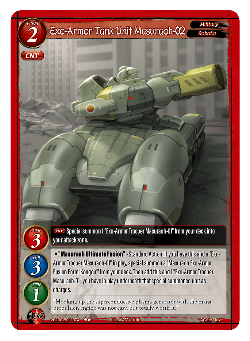 ■"Masuraoh Ultimate Fusion" - Standard Action: If you have this and a "Exo-Armor Trooper Masuraoh-01" in play, special summon a "Masuraoh Exo-Armor Fusion Form 'Kongou'" from your deck. Then add this and 1 "Exo-Armor Trooper Masuraoh-01" you have in play underneath that special summoned unit as charges.