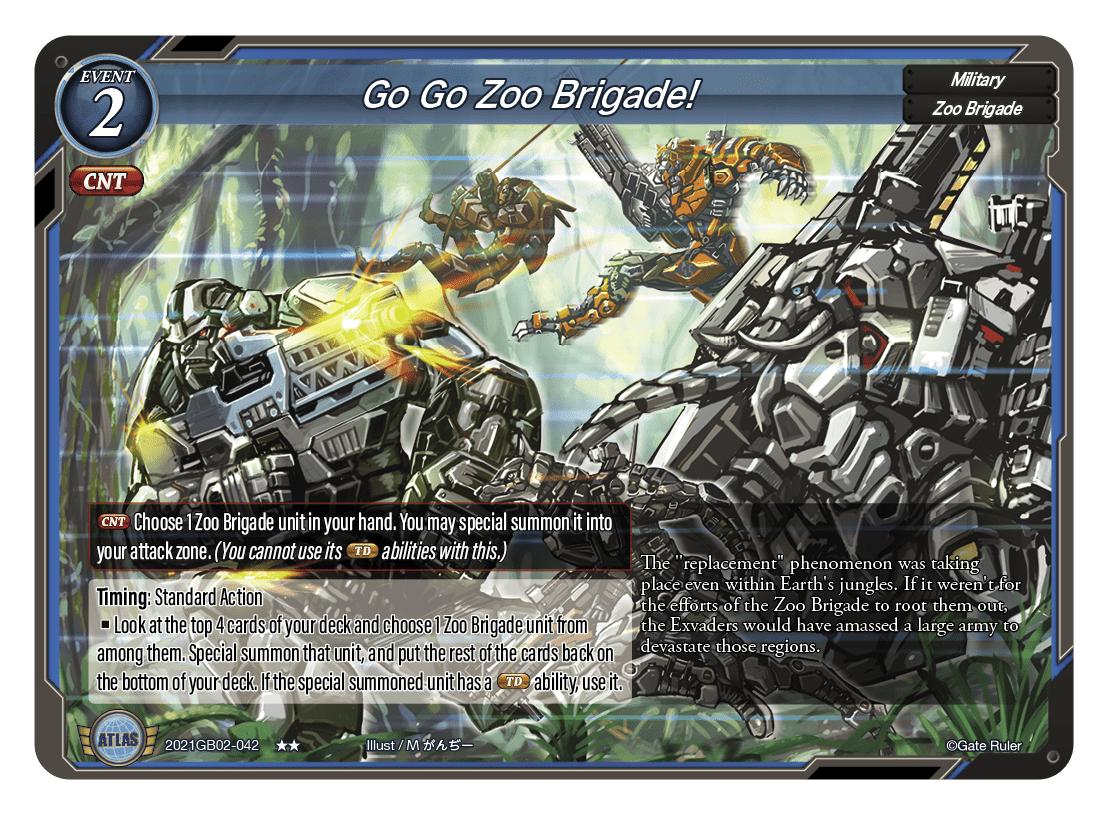 ■Look at the top 4 cards of your deck and choose 1 Zoo Brigade unit from among them. Special summon that unit, and put the rest of the cards back on the bottom of your deck. If the special summoned unit has a 【TD】 ability, use it.