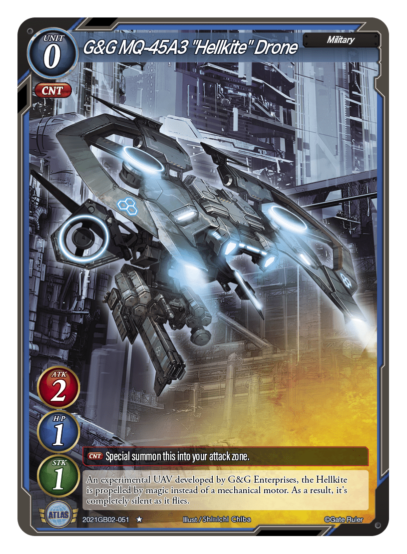 An experimental UAV developed by G&G Enterprises, the Hellkite is propelled by magic instead of a mechanical motor. As a result, it's completely silent as it flies.
