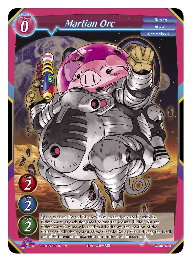 Space explorer Ed and his crew have clashed repeatedly with the Crimenauts, as each side raced to find the Cosmic Relics. But the Crimenauts have now learned that Ed knows the location of the Galactic Grail, the greatest of the Cosmic Relics. Can Ed keep the Grail out of Crimenaut hands? Find out in the next booster set!