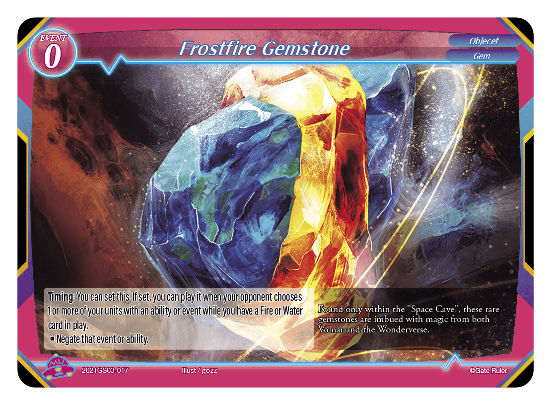 【Timing:】 You can set this. If set, you can play it when your opponent chooses 1 or more of your units with an ability or event while you have a Fire or Water card in play.