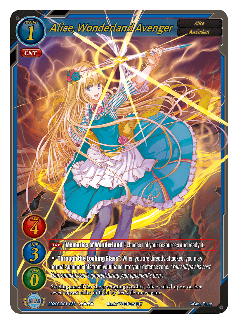 ■"Through the Looking Glass": When you are directly attacked, you may normal summon this from your hand into your defense zone. (You still pay its cost. Your summon cap is ignored during your opponent's turn.)