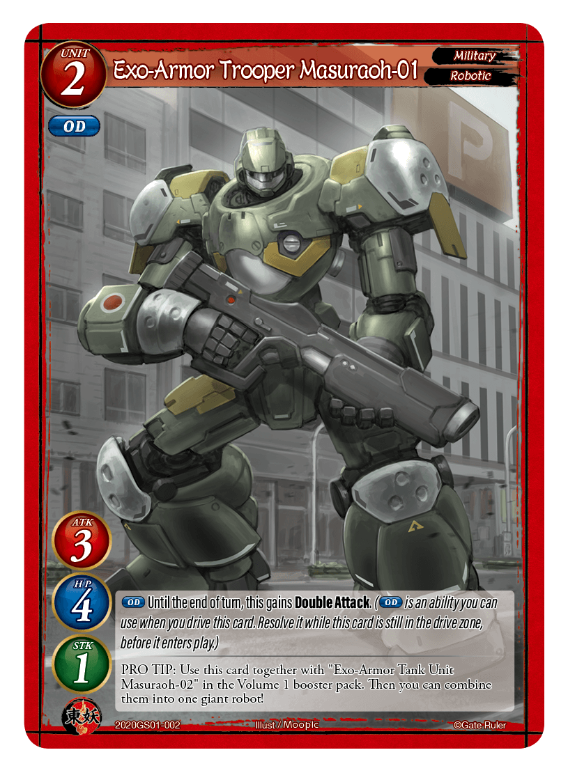PRO TIP: Use this card together with "Exo-Armor Tank Unit Masuraoh-02" in the Volume 1 booster pack. Then you can combine them into one giant robot!